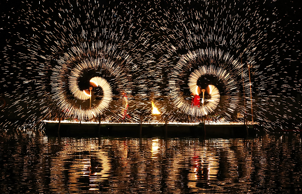 在灞陵橋景區(qū),首屆三國主題大型燈會構(gòu)建起“三國光影敘事長廊”。30位三國人物NPC全天候散落景區(qū),開園迎賓、三國大巡游、主題舞蹈、豫劇相聲輪番上演。“打鐵花”非遺表演與“水上飛人”特技在春節(jié)假期及元宵期間聯(lián)袂獻(xiàn)技,水火交融的視覺奇觀讓游客驚嘆不已。