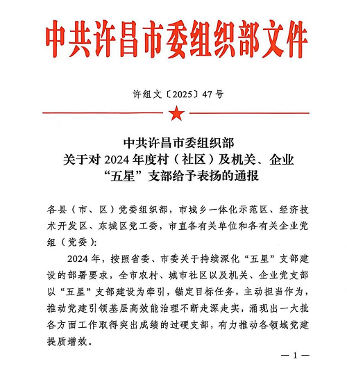 近日,中共許昌市委組織部印發(fā)了《關(guān)于對2024年度村(社區(qū))及機(jī)關(guān)、企業(yè)“五星”支部給予表揚(yáng)的通報》,許昌市投資集團(tuán)黨委被繼續(xù)授予“五星”支部榮譽(yù)稱號,這是集團(tuán)黨委自2022年以來連續(xù)三年獲此殊榮。